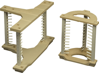Our pin systems are designed to minimise firing costs. Reusable and ultra-low weight, the Pin Crank frames allow you to achieve very high packing densities, maximising your kiln usage.